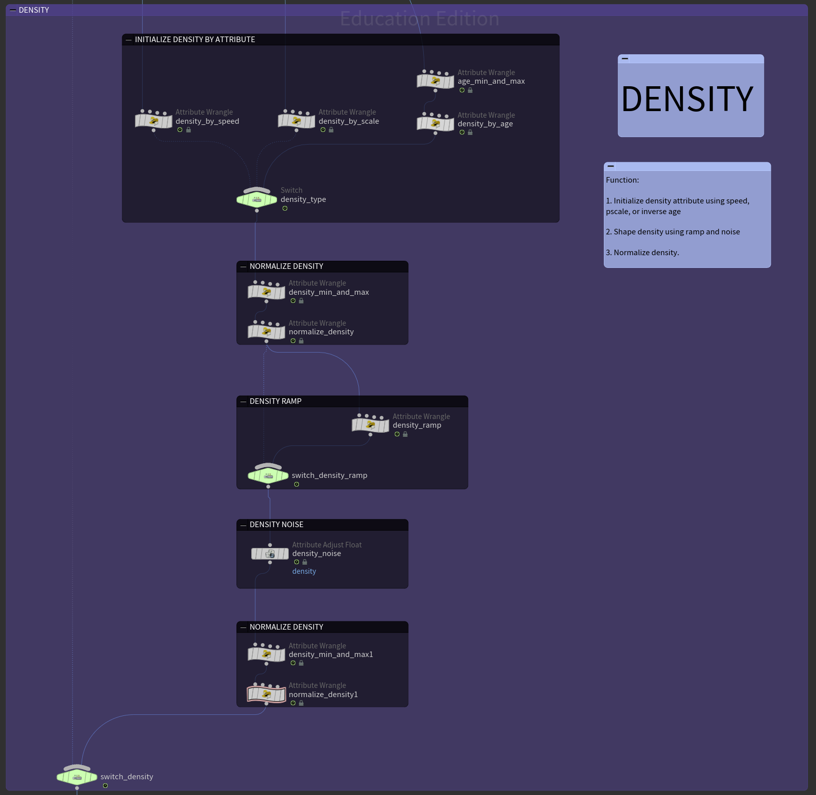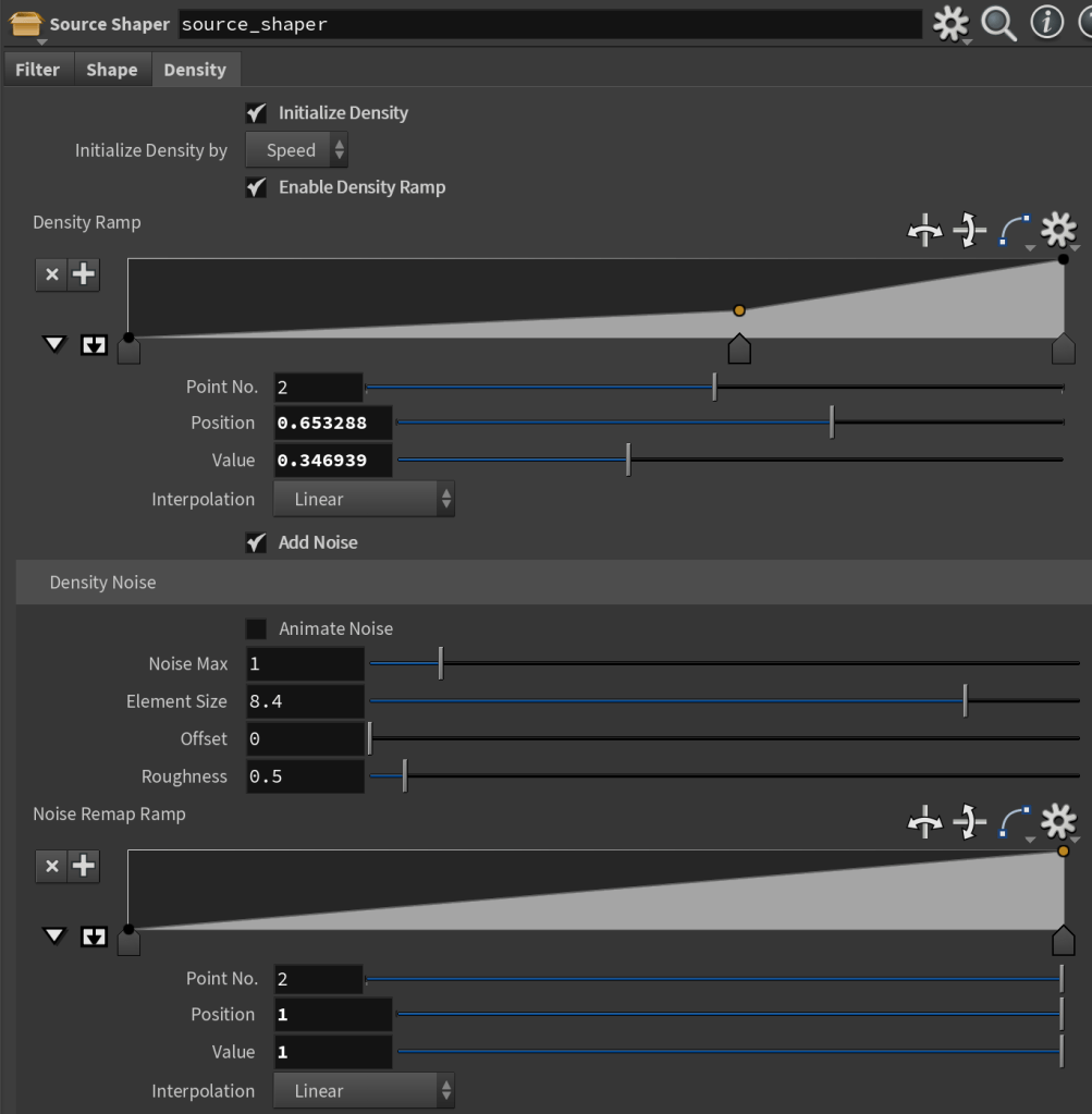 The Density Tab initializes a normalized density attribute on the points using speed, pscale, or inverse age, defaulting to 1 across all points if none of the given attributes are present. Noise and ramp parameters allow for variation in the distribution of density and improved aesthetic control over the simulation.