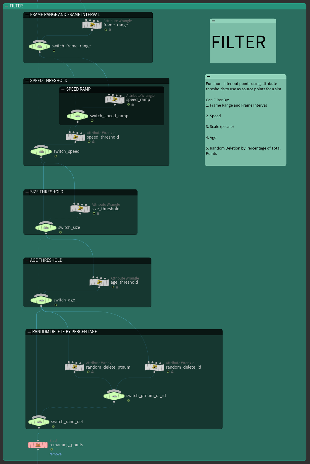 Description: Filter and shape points for more art-directable simulation sourcing. Initialize attributes to source into simulations. For best results, use with the output of a POP sim, but can be used on any points.
