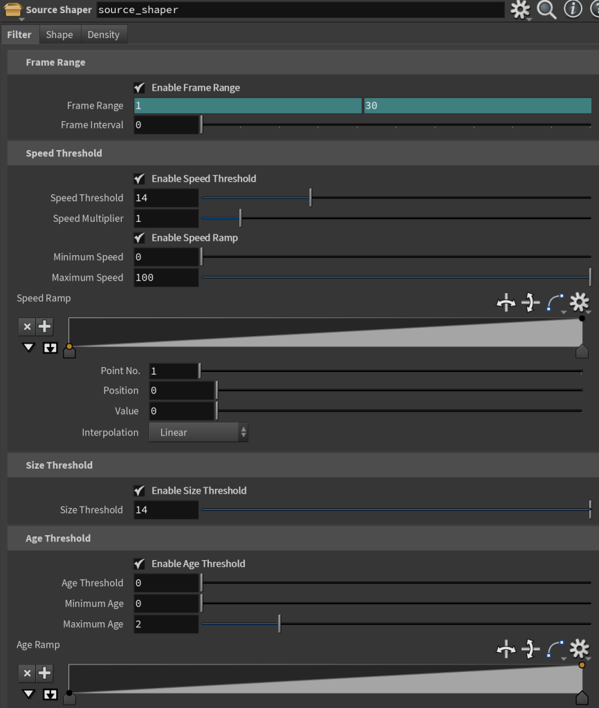 The Filter Tab can be used to filter particles and points based on attribute thresholds such as speed, size, and age. Additional filtering options such as filtering by frame range and frame interval (modulo to only keep source points every given number of frames) as well as a randomized deletion of a percentage of the total points are helpful to limit the overall number of source points.