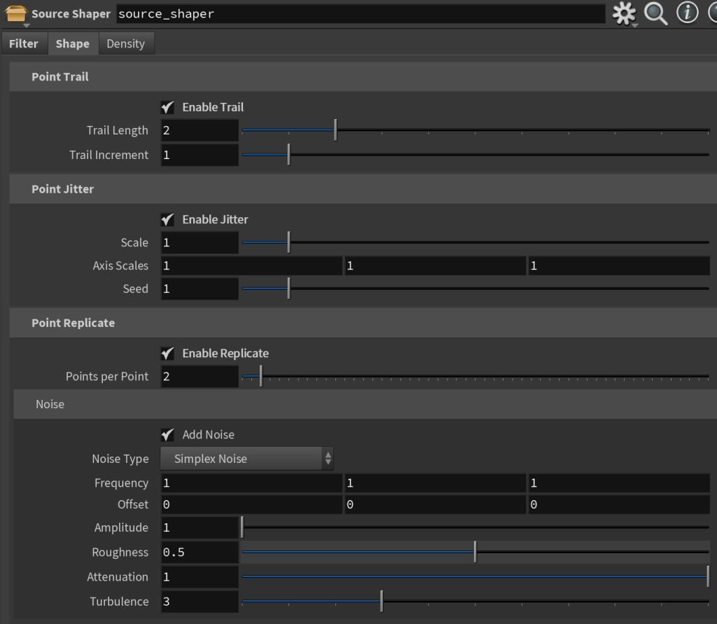 The Shape Tab can be used to generate point trails, replicate points, and add noise to point positions to define the overall shape in preparation to sourcing.